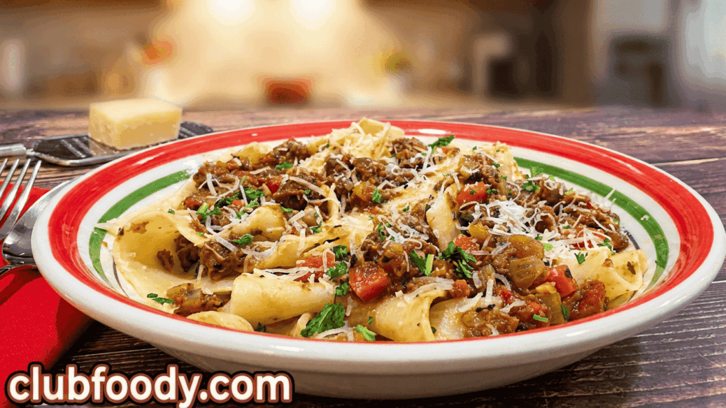 - Serve ragù over pappardelle, sprinkle on some Grana Padano cheese and garnish with fresh chopped parsley.