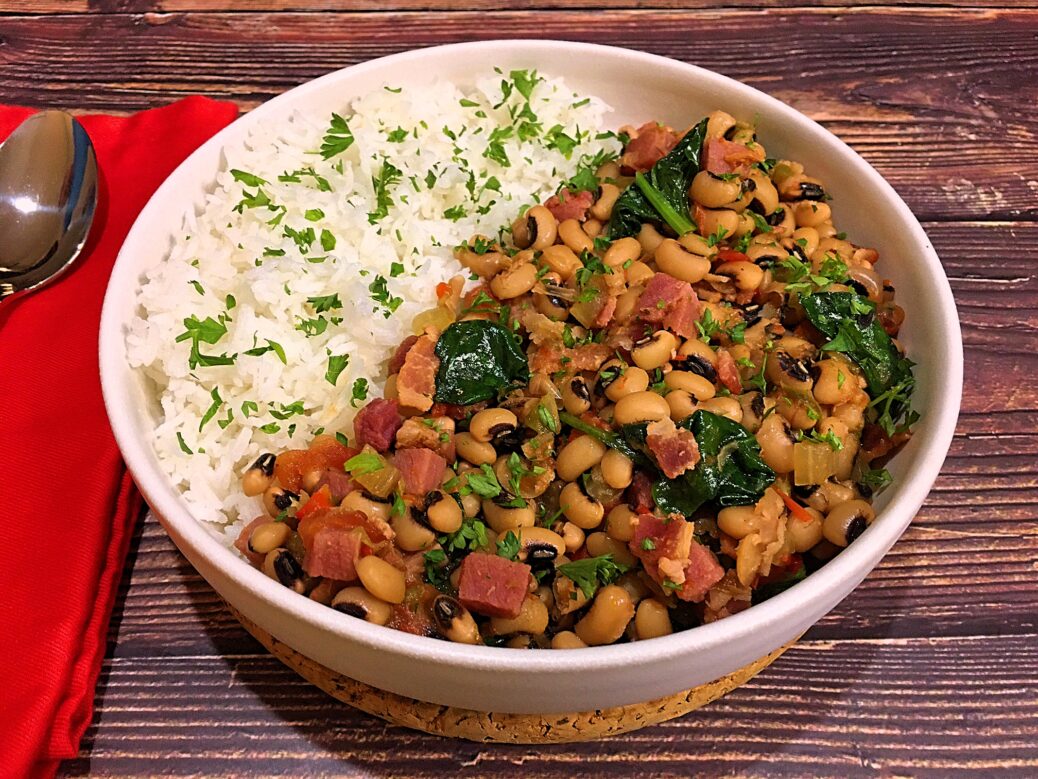 In the Southern part of United States, they enjoy black-eyed peas which symbolize pennies (or coins), along with collard greens because of its color that coincides with the US currency shade 💵. These two important ingredients are combined together in this popular dish… Hoppin’ John!